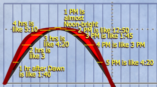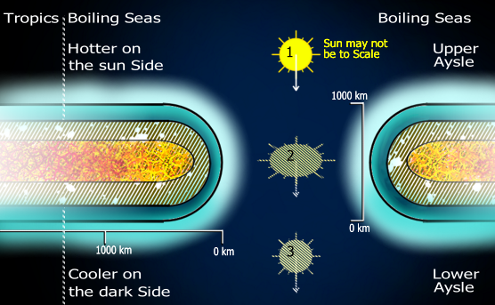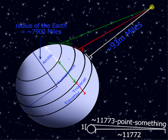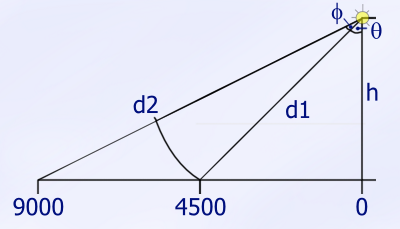 So, how big is the sun? Radius 9000, and the temperate regions are about 1/2 out, so distance 4500km. The sun goes up into the sky a certain height and then comes down again. (Why? Get to that later).