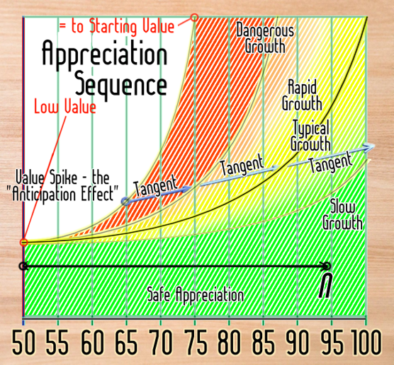 The dangerous growth line is set to an N of 25 and this marks a threshold to be crossed only at your peril. Anything faster than this is almost certain to suffer a value collapse – possibly even within the 50-year appreciation span showing. The growth in value is (generally) unsustainable.