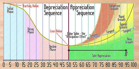 - 21+ years if increase: highly speculative and extremely risky. Tangents are almost certainly downwards, and between 30° and 45° in slope (50 years × 100% graph)..That generally means that in 10-15 years, the tangent will intersect the true value line.
