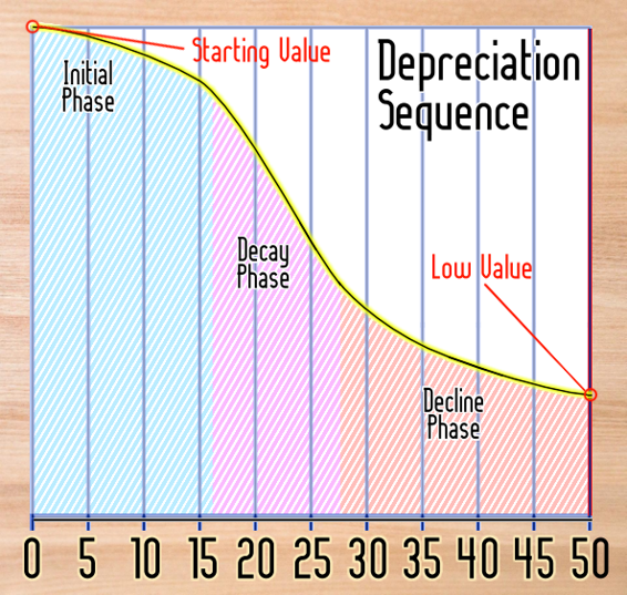 Depreciation isn’t really a constant change, despite all attempts to treat it that way by accountants. There are three phases –