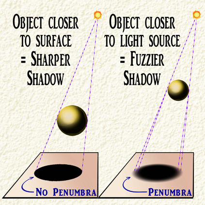 A Penumbra is the fuzziness around a shadow where the object casting that shadow is more distant from the surface onto which the shadow is cast. The technical definition is ‘a region of half-shadow resulting from the partial obstruction of light by an opaque object’.
