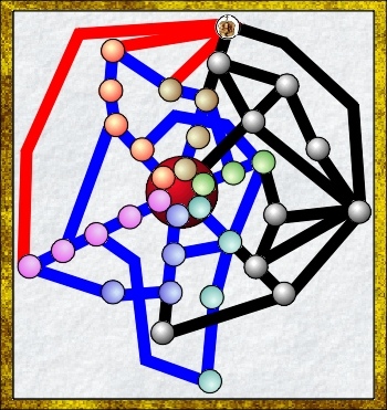 Consider this example. The Six PCs are at the centre of the network, and the links that connect each of them to the others are shown in blue. Links between the people on the network and the Crown are shown in Red. Links between NPCs are in black. Right away, the primary villain stands revealed to the GM (at the far right), and the fact that many of his lieutenants have associations, direct or indirect, with people connected socially to half the party, as well as to the King and the King’s #2 man. It is also clear that thus far, the PCs have only had one direct contact with the enemy.