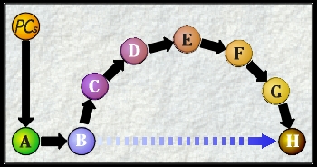In the real world, the sophistication of social networks extend many layers deeper than this, but, in an RPG, I would suggest that the best way of counting degrees of seperation should be one, two, three, many. Consider the situation in which a PC calls apon one of the contacts that I described above and asks him to use his influance over others to cause a certain action to take place; what the character is actually asking the NPC to do is to direct a third party to act apon a fourth, establishing a three-degrees-of-seperation relationship between the PC and the target of the action, regardless of how many degrees of seperation had previously seperated that third party and the target, as shown by the illustration below.