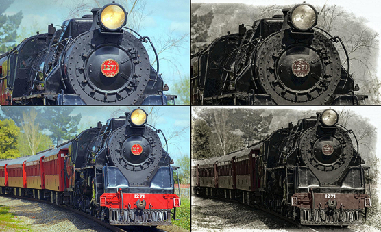This image places two representations of the same train from two different sources side-by-side. Which image you choose depends on the impression that you intend to convey. The mostly grayscale image was provided by Brigitte Werner, the color image is from blizniak, both from Pixabay, cropping and compositing by Mike.