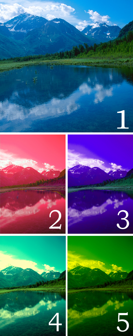 Image 5 runs the same process in the other direction, producing a more dramatic change. If you were to tell someone who ‘saw’ colors this way that the sky was blue and the trees were green, they would be confused because there isn’t that much difference in their eyes between the two.