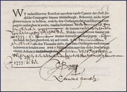Bond issued by the Dutch East India Co, 1622-1623, some editing (relocated annotation) by Mike, original image by Oost-Indische Compagnie (Netherlands) (Beinecke Rare Book and Manuscript Library) [Public domain], via Wikimedia Commons. You can view the unmodified original by clicking on the image.