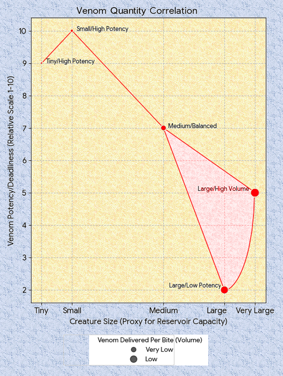 As a general rule of thumb, the less venom, the deadlier it has to be, because volume decreases as the cube of linear size. The venom therefore has to become more potent just to keep up. Larger creatures have much more venom, which they can utilize in a number of different ways, one species compared to another. On top of that, smaller creatures are less physically resilient, and need to end combat encounters more quickly in order to survive – so that’s an extra push toward higher toxicity
