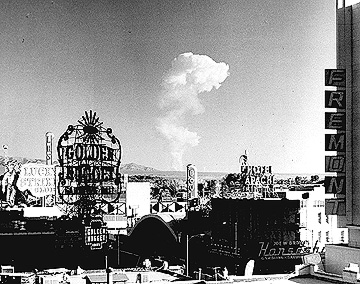 Downtown Las Vegas with a mushroom cloud in the background. Scenes such as this were typical during the 1950’s. From 1951 to 1962 the government conducted 100 atmospheric tests at the Nevada Test Site. Photograph from the National Nuclear Safety Administration, Nevada, via Wikipedia.