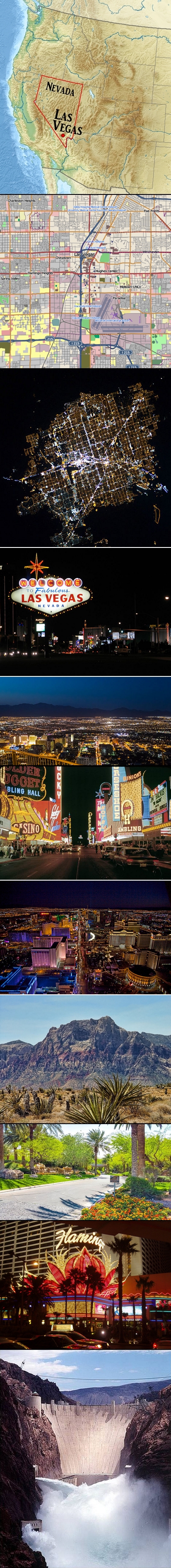 - Las Vegas at Night (2013) by Joao Carlos Medau from Campinas, Brazil via Flikr and Wikipedia Commons, License CC-2.0. This image shows “greater” Vegas, including the surrounding valley.