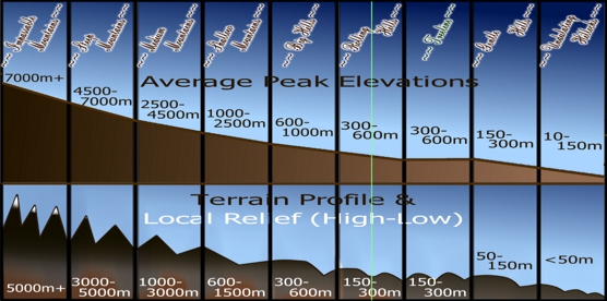 Which means, I guess, that I should talk about how such things are classified in this system. There are eight elevation categories, but the categories themselves are based on the differences between peak elevation and base elevation.